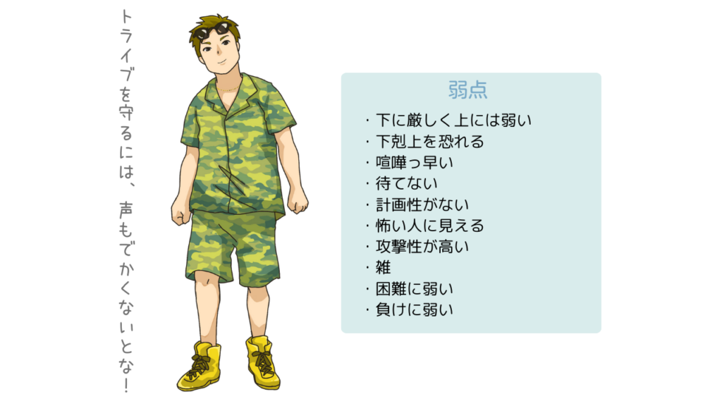 - 上下関係の意識: 上に弱く、下に強いという上下関係を意識する側面があり、下の人には面倒見が良いです。