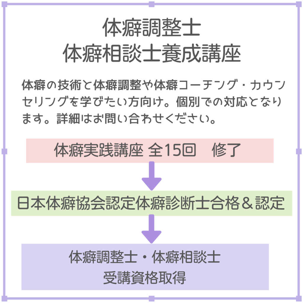 体癖調整士・相談士講座の内容につきましては、日本体癖協会代表のソシャフィアまでお問い合わせくださいますようお願い致します。